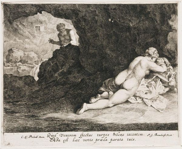 Curator: Let's discuss Alphonse Legros's striking print, "The Conflagration," housed here at the Harvard Art Museums. What's your initial reaction? Editor: Raw terror, almost palpable! The etching is just a furious network of lines, but they convey so much panic. Curator: Exactly, and consider Legros's process – the acid biting into the metal plate, creating these frantic marks. It mirrors the destructive energy he's depicting. Editor: It's about more than just the fire though, isn't it? The slumped shoulders of the man carrying a child...the woman shielding her face. It screams of societal disruption. Curator: Certainly. It speaks to the vulnerable laboring classes and the ever-present threat of their world collapsing, quite literally, in flames. Editor: And the starkness of the print, the near absence of any comforting detail, reinforces the vulnerability of their material conditions. Curator: True. It's a poignant reminder that even in art, fire reveals more than it consumes. Editor: Ultimately, a work of stark beauty born from the harsh realities of labor.