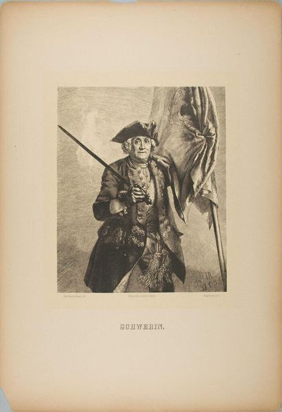 Curator: Standing before us is Eduard Kretzschmar's portrait of Field Marshal Curt-Christoph von Schwerin. Editor: He looks like he's stepped straight out of a heroic fable, all swagger and sword. What's the story behind this portrayal? Curator: Schwerin was a celebrated military figure, and this image, I believe, reflects the 19th-century impulse to elevate such figures into symbols of national pride and martial virtue. Editor: The flag behind him seems almost spectral, like the weight of history itself bearing down. Does it glorify war or hint at its burdens, I wonder? Curator: Perhaps Kretzschmar intended to capture both sides of that coin, the valor and the sacrifice. The print definitely leaves room for such contemplation. Editor: It does offer a certain starkness—a very thoughtful study.