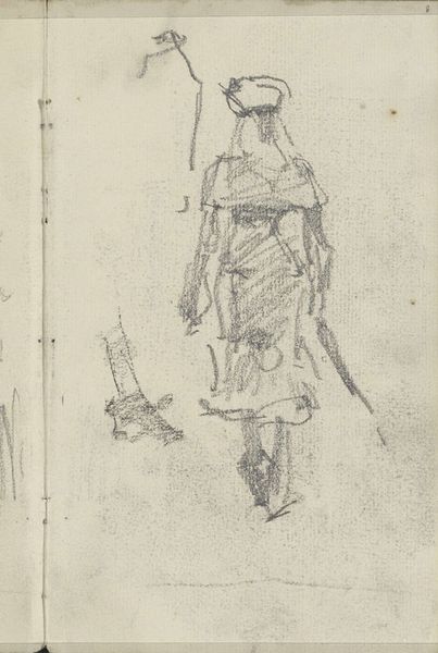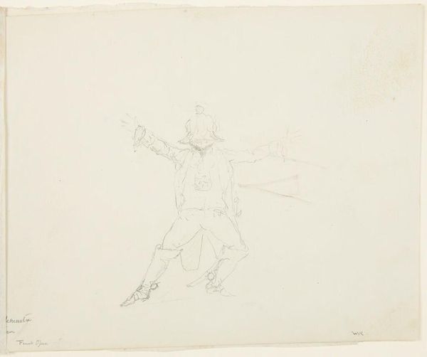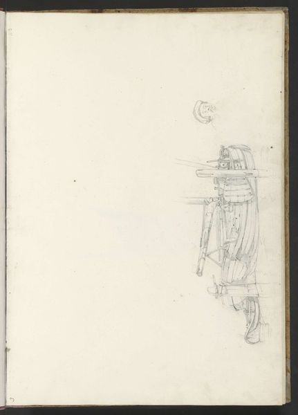 Curator: We're looking at a pencil drawing titled "Twee mannen op een zeilboot," which translates to "Two Men on a Sailboat," by Johannes Christiaan Schotel, made sometime between 1797 and 1838. It’s currently in the Rijksmuseum collection. Editor: It's spare. Such delicate, light pencil strokes – the near absence of material. I'm immediately drawn to the paper itself. Was it expensive at the time? What would a drawing like this be *for*? Curator: It reflects the Romantic period fascination with nature, with man dwarfed by the sublime. Notice how the sailboat dominates the tiny figures of the men; the image evokes a sense of their vulnerability against the backdrop of the vast sea. The ship becomes a symbol for humanity braving an uncertain world. Editor: But what does “vast sea” mean in a tiny sketch? Schotel economically renders the sails – they’re just wisps, almost nothing at all. Maybe Romanticism isn't just grand feelings, but the artist making the best of humble materials in the face of his own limited resources. A metaphor, if you like, for facing a material world with artistic creativity. Curator: Perhaps, but the detail in the rigging suggests a different perspective. Consider the precision required to capture this craft's complex structure; it hints at deeper symbolic consideration for navigation, exploration, and our innate longing to venture into the unknown. The image itself, in its simplicity, calls on our memory, inherited memory if you like, to imbue that detail with a full and vibrant range of associated cultural concepts. Editor: That inherited memory itself is made *of* materials though; passed on and manifested as language, stories and craft techniques. What kind of pencil did Schotel even use? Where was it made? These little drawings aren't just containers of “universal human themes” they're records of a material and social network. Curator: A lovely perspective on its context, focusing as you do on how it all came to be materially. Editor: Indeed, and now when I look at this modest drawing, I consider it a tangible, touchable connection across time and space.