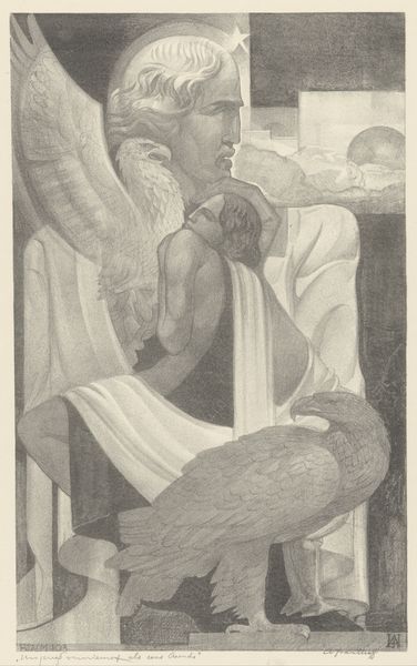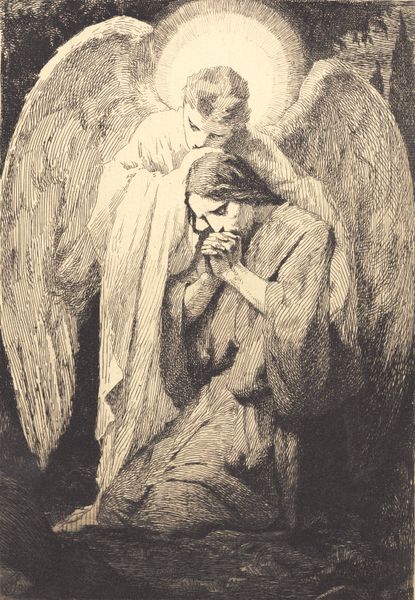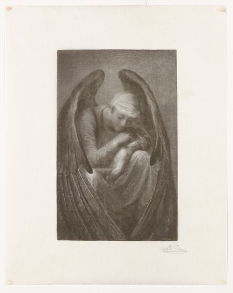 Editor: This is Frank Short's "The Sorrowing Angel," and it evokes such a profound sense of grief. What sociopolitical contexts might have influenced Short's choice to depict an angel in such a state of despair? Curator: That's a vital question. Consider the late 19th and early 20th centuries. The rise of industrialization and its impact on society, the looming presence of war, and the changing roles of religion all contributed to a widespread sense of anxiety and disillusionment. Does that context shift your perspective? Editor: It does. Seeing it as a reflection of societal anxieties rather than just personal sorrow adds another layer of meaning. Curator: Exactly. The angel's sorrow might represent a collective mourning, a questioning of traditional values in a rapidly changing world. Art often holds up a mirror, doesn't it? Editor: It certainly does. I'll remember to consider that.