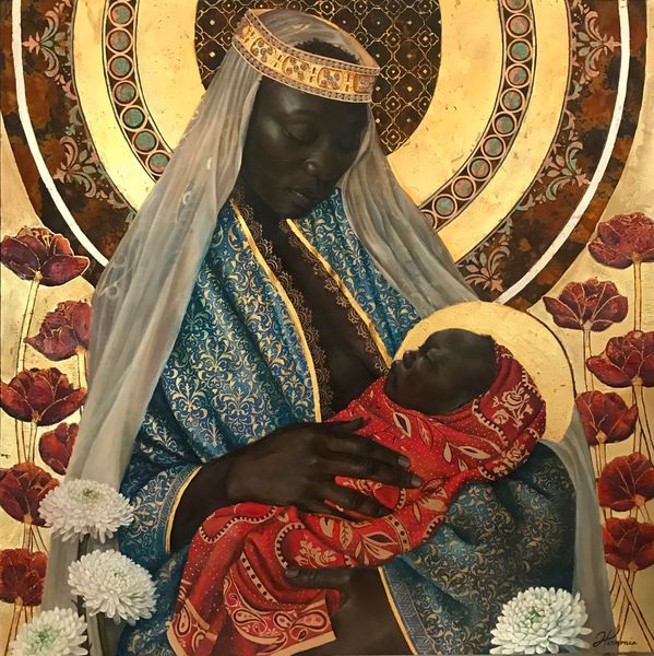 Editor: Here we have Koloman Moser’s “Am Steinhof Church, Design for the left side altar Our Lady of Mercy,” created in 1904. It's a watercolor and paint design. The halos around the figures and use of gold give the piece a very regal, almost Byzantine feel. What stands out to you about the way this was crafted? Curator: For me, it is impossible to disassociate the design from the environment in which it was made, that is, turn-of-the-century Vienna, an imperial city full of tension where decorative arts challenged the old establishment of academic fine arts. I see here a pointedly conscious effort in how the material realities intersect with ideas of spiritual devotion. Editor: How so? Can you give me an example? Curator: The gold leaf isn’t just ornamental. Its application, the way it reflects light within the church, becomes part of the devotional experience. The materials become as crucial as the image itself. Similarly, we see this incredible attention to detail, these near-miniature flowers in the background and geometric tessellations, pointing towards a shift where so-called craft idioms gain recognition. This would become a key feature of the Wiener Werkstätte that Moser would later help found. The actual labor involved in creating these details elevates the everyday to the sublime. Does that make sense? Editor: Absolutely, it helps to see the physical and material production, the way it's produced, as part of the artwork's purpose and power, which then transcends that production. Curator: Precisely. It redefines what "art" even means by considering its means. Editor: I learned something new here! Thanks for shedding light on that shift, not just the pretty colors but thinking about how this was physically realized.