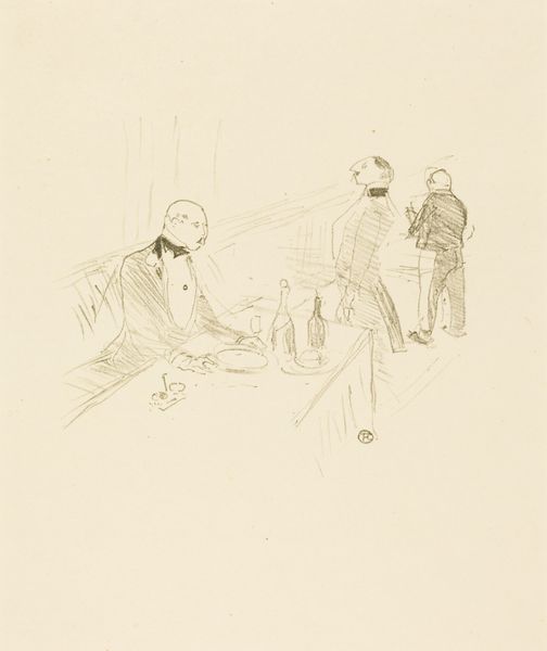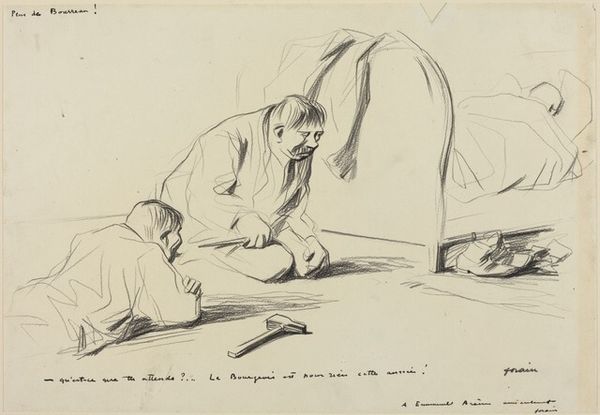 Jean-Louis Forain created this drawing, "To Each His Own," using graphite on paper. It's a quick, economical medium, suited to capturing fleeting moments – a skill Forain honed as a satirical illustrator for Parisian newspapers. The apparent ease of the drawing belies its social critique. Forain uses a few deft lines to depict a tense encounter: a well-dressed man holding a glass, seemingly interrupted by an intimate moment between a woman and another man. The stark contrast between the detailed figures and the sparse background suggests a world reduced to its essentials: desire, possession, and perhaps, betrayal. Forain's choice of graphite allows for subtle gradations of tone, emphasizing the characters' expressions and gestures. The sketch-like quality hints at the immediacy of modern life, where relationships are often transactional and emotions are laid bare. By focusing on the raw reality of human interactions, Forain challenges traditional artistic conventions, offering a glimpse into the complexities of modern morality. This piece reminds us that even the simplest materials can convey profound social commentary, blurring the lines between observation, craft, and art.