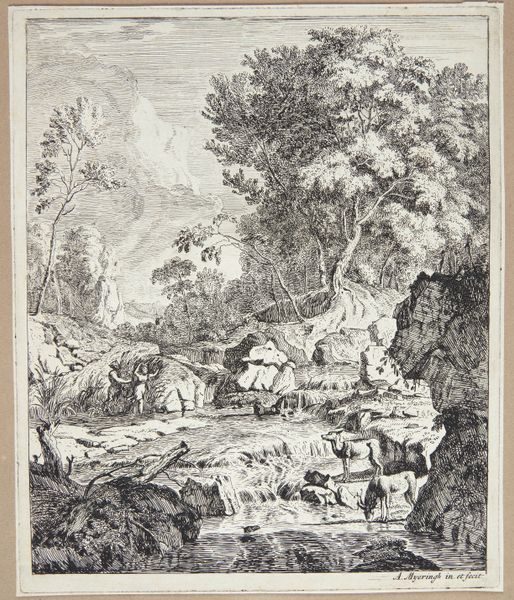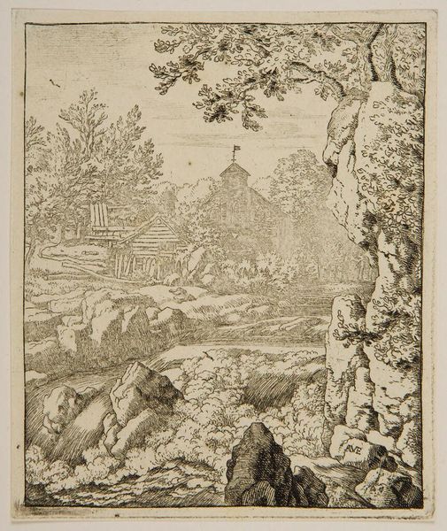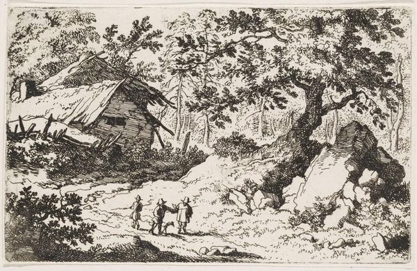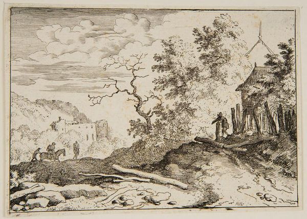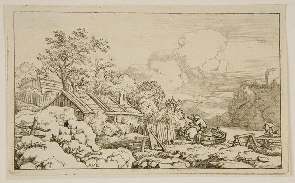 Curator: This is Allart van Everdingen’s "Landscape, with a Millstone". Editor: It feels so intimate, like stumbling upon a hidden world. Curator: Van Everdingen, born in the 17th century, often depicted Scandinavian-influenced landscapes, and it’s fascinating to consider how he rendered such rustic scenes using etching, a process involving acid, metal plates, and careful labor. Editor: Notice how the millstone isn’t just ornamentation; it implies industry, the community, and the material realities of that era. I can only imagine the kind of lives of those two figures seated outside the cottage. Curator: Absolutely. The millstone signifies a form of resource extraction and labor integral to society, presented here in a seemingly harmonious balance with nature, though that relationship could very well be more complex than it appears. Editor: True, and the print, meant to be disseminated, played a public role in shaping ideas about Dutch landscape and its relation to its people. Curator: It’s a thoughtful image, reminding us of the interplay between nature and human endeavor. Editor: Indeed, seeing how everyday labor and landscape coalesce in such a delicate way allows a glimpse into art's capability to shape societal values.
