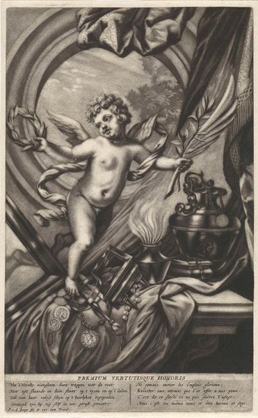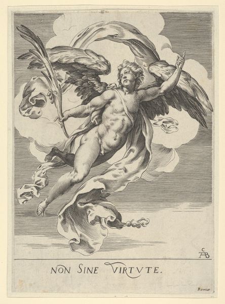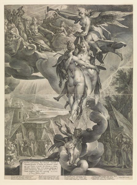 Editor: This engraving, "Allegory of Hope" by Johann Sadeler I, dating from 1560 to 1600, feels incredibly dense with symbolism. The central figure, a nude woman, stands on a block with an anchor, accompanied by other figures that all contribute to this image. How do you interpret this work, particularly given the period it was created in? Curator: Indeed! It is incredibly dense and also a classical reinterpretation from the period. The symbolic weight is fascinating. I see this Hope as deeply intertwined with both faith and the turmoil of the Reformation. The anchor, a longstanding Christian symbol of steadfastness, suggests a reliance on something beyond the earthly realm. Editor: So the anchor serves as a visual cue to its religious associations, how is it relevant to Hope personified? Curator: Precisely. Hope, standing confidently, embodies resilience amid the chaos suggested by the struggling figures below and turbulent sky, where we see a symbol of YHWH written in Hebrew. In the context of the late 16th century, wracked by religious conflict, this image may propose that true hope lies in divine protection and constant adherence to traditional virtue as demonstrated by a sacrificial lamb. What elements strike you most powerfully? Editor: The lamb! The detail of the lamb made me think that this allegory also considers themes of sacrifice, maybe hope requires some type of painful letting go. Curator: Yes, your interpretation aligns nicely! These visual emblems echo long and deep cultural and spiritual yearnings that speaks beyond its own era. Looking at the full composition in Sadeler's depiction, the image is imbued with faith, tradition, personal sacrifice, and also resilience. Editor: It's amazing how much cultural meaning can be layered into a single image. This feels especially important with its original creation time in mind.