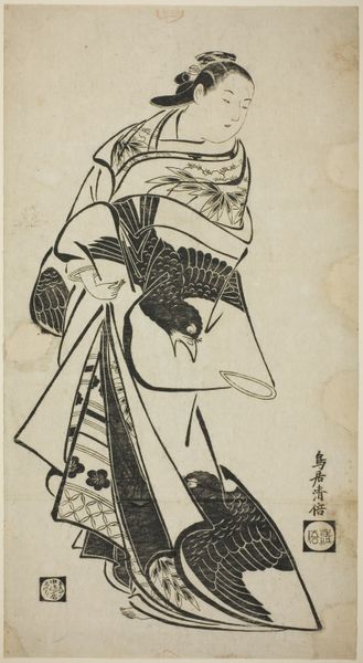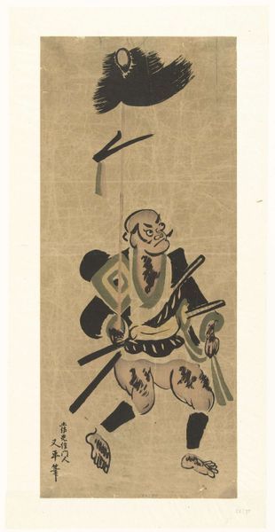 Katsukawa Shun'ei created this woodblock print of an actor as Sadakuro, likely in the late 18th or early 19th century. The composition presents a full-length figure against a muted ground, the actor depicted in a dramatic pose, drawing our eye with the strong contrast of black robes against the lighter, bare skin and the glint of metallic details on the swords. Shun'ei masterfully manipulates line and form to convey character and emotion. Look at the actor’s stance, the angle of his sword, the set of his jaw – all these elements work together to suggest a narrative moment charged with tension. The flatness of the print, typical of ukiyo-e, enhances the graphic quality of the image. The bold lines of the robe contrast with the delicate rendering of the face and hands. This print is not just a portrait of an actor, it's a study in representation, using stylized forms and symbolic gestures to convey the essence of a role. Shun'ei's work reflects a sophisticated understanding of visual communication, where every line and color contributes to a complex semiotic system.