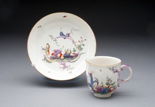 Curator: Here we have a charming porcelain cup and saucer, believed to have been crafted around 1745 by the Meissen Porcelain Manufactory. Editor: Oh, how delightful! It gives me the sensation of spring itself has decided to materialize within these delicate curves. There is this feeling that even birds are flying nearby... Curator: Precisely! Meissen, as many know, truly pioneered European porcelain, breaking the East Asian monopoly on the material. What do you notice about the decoration here? Editor: Well, first I am captured by all these flower swags, then by those freely painted birds... However, knowing that it is porcelain makes me think about the extreme skill involved: the molding, the firing, the hand-painting that gives it so much life... Who knew it needed so much manual labour? Curator: It is indeed astonishing, and the floral designs were highly fashionable at the time, drawing inspiration from botanical prints that were flooding Europe. Interestingly, the birds are rendered in what's called "deutsche Blumen" style—individual, naturalistic representations rather than symmetrical bouquets. Editor: Fascinating. But is it more than decoration? In this tiny set, one cannot avoid seeing the emergence of capitalism, class, the politics of luxury... These dainty forms were instruments for creating an entire social etiquette. Curator: That's very well put. Porcelain served not only a functional purpose, but also became a display of wealth, of refined taste and leisure—and the Rococo style certainly amplifies that effect with its playful asymmetries and elegant frivolity. It almost feels as though it captures the essence of fleeting pleasure, doesn't it? Editor: Absolutely, its delicate fragility carries something transient... one must be gentle with it, right? A subtle piece, like so many that tell great tales of long gone days. Curator: A potent reminder that even the simplest cup carries layers of stories and ideas within its form.