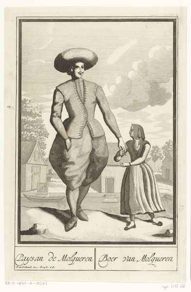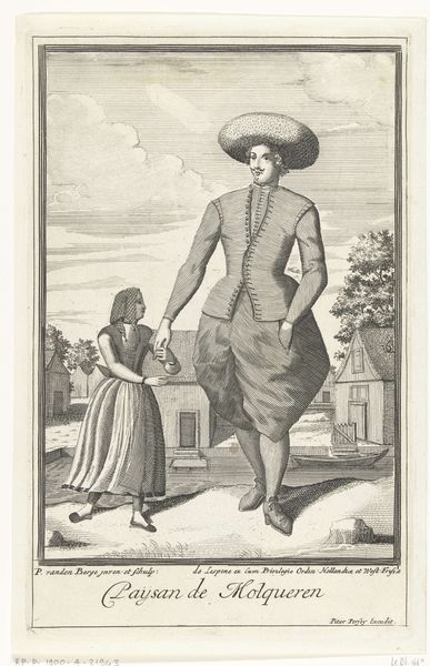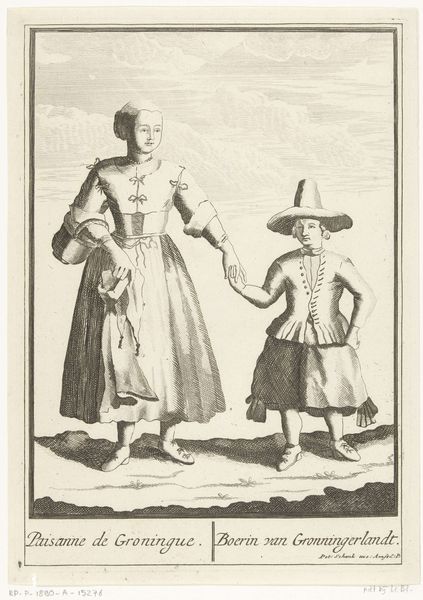 Editor: Here we have Pieter van den Berge’s engraving, "Boer uit Groningen," made before 1713. The figures’ clothes feel strangely exaggerated and their expressions are quite formal. What should we make of this depiction? Curator: This print offers a fascinating window into early 18th century Dutch perceptions of rural identity. The man’s exaggerated clothing – that conical hat, those voluminous breeches – isn’t necessarily a straightforward depiction, but rather a commentary. Think about who was commissioning and consuming these images. Editor: I see. So, you're saying it's not necessarily an accurate portrayal of how farmers actually dressed? Curator: Exactly. Consider how class distinctions were being reinforced and negotiated through visual representation. Was it a satire? Or, were the artists trying to underscore stereotypes of rural folk? Editor: Hmm, that’s really interesting, especially the power dynamic between the artist and his subject. The image, seemingly simple, becomes loaded. The act of looking at this artwork turns into a critique of representation. Curator: Precisely. And don't overlook the woman accompanying him. How might her presence challenge or reinforce those existing stereotypes and social positions? Editor: Good point. It’s easy to focus on the man's attire, but her role is also critical to examine. It also suggests that these images played a role in shaping, rather than simply reflecting, social hierarchies. Thank you for that eye-opening interpretation. Curator: My pleasure! I will walk away reflecting upon it too.