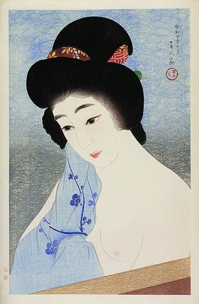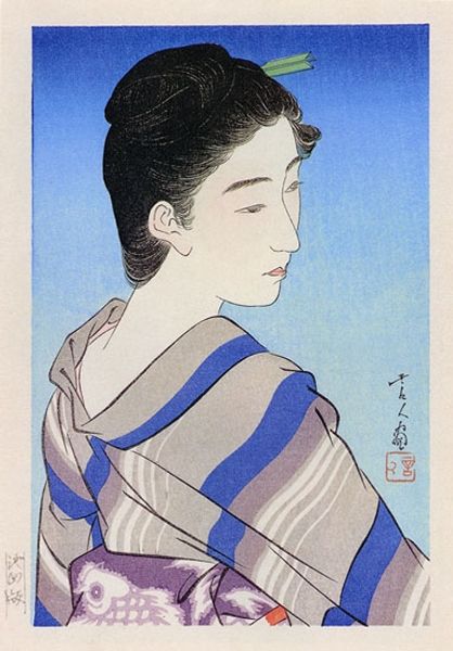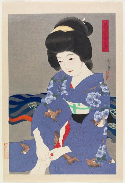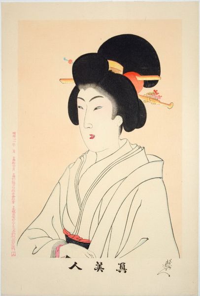 Editor: This is "Ichimaru," a woodblock print made in 1933 by Kobayakawa Kiyoshi, now at the Minneapolis Institute of Art. There's a certain quietness to this portrait that I find captivating. It’s the focused gaze downward, maybe contemplating some letter? What catches your eye in this piece? Curator: That quietness resonates deeply, doesn't it? I feel drawn into her private world. It reminds me of those fleeting moments of introspection we all experience. But, consider the era – the 1930s in Japan. It was a period of intense social and political change. Could this image be subtly hinting at the societal expectations placed upon women at the time, the pressure to be demure and introspective? Or is she perhaps lost in her own thoughts, dreams maybe. What do you think, is there a certain melancholic beauty here? Editor: Yes, I can see that melancholic beauty. It also made me think, the Ukiyo-e tradition often depicted courtesans, and the title "Ichimaru" suggests a personal name. Does that point to the identity or role of the woman portrayed? Curator: Ah, an excellent observation! “Ichimaru” was indeed a common name for geisha at the time. The Ukiyo-e tradition often blurred the lines between portraiture and idealization, and Kobayakawa here creates an idealized vision. Her gaze and the traditional garment speak of beauty, artistry, and dedication to cultural refinement. Now look at the textures - notice the detailed patterns on her kimono against the smooth, almost dreamlike quality of her face? Editor: Yes, it's quite subtle, almost like a photographic focus trick! What did the Ukiyo-e tradition try to communicate? Curator: I'd argue that through refined artistic means, these artworks prompt reflection about personal identity and societal expectations, even today. And they invite viewers to consider the intricate balance between an idealized vision and everyday realities. Editor: So, more than just a portrait, it's a cultural snapshot and maybe a quiet reflection on being a woman then, told through beautiful lines and textures. Thanks!