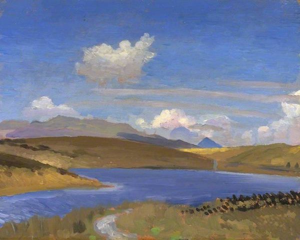 Editor: This is a piece called "Anglesey" by Richard Jack, made using oil paint. It's got a wonderfully muted palette, and seems to capture a still, breezy moment. I am interested in learning more. How would you interpret this work? Curator: What immediately strikes me is the plein-air approach, emphasizing the raw materiality of the landscape. Consider the physicality of the paint application itself. Notice the short brushstrokes, applied with clear effort. Do they not suggest a certain labor involved in capturing the scene? Editor: Yes, you're right, the strokes are quite deliberate. Was that a common practice in the historical context? Curator: Absolutely. Think about the broader context. The late 19th and early 20th centuries saw increasing industrialization. This piece and others like it may reflect a longing for a connection with nature. The choice to work directly from the landscape is meaningful. Do you think that's related to how this landscape is produced? Editor: I suppose so, in a sense. The materials had to be acquired, prepared, and transported to Anglesey... almost as if it’s highlighting the production and journey. I hadn't considered that before! Curator: Exactly! And reflect upon the act of consumption – of land, resources, the romantic vision of the landscape being circulated for a consumer’s gaze. How might that affect your impression? Editor: That makes me see the work with different eyes. I was so caught up in its appearance of simple beauty! Thanks. Curator: Indeed, and it also gives insight into landscape and labor beyond merely representation. The art helps unpack not just a pretty picture, but where all those brushstrokes really came from.