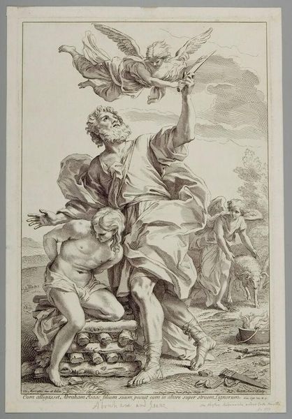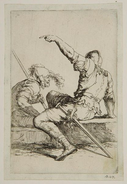 Curator: Salvator Rosa's etching, Young Man Sitting on a Wall and Speaking with Two Men, has a really intense feel for such a small piece. What jumps out at you? Editor: Definitely the tension in the central figure's arm, and the almost aggressive way the lines are etched. There's a palpable sense of unease. Curator: Rosa, born in 1615, was known for his dramatic and often violent scenes. He was quite the rebel. Do you think it translates into the scene? Editor: Absolutely. The men almost seem to be cornering him. I read that as a metaphor for the social constraints placed upon young men, especially concerning class and expectations. Curator: Or, perhaps, it’s just a heated debate amongst friends after one too many glasses of wine? I do love leaving things open to interpretation. Editor: That's the beauty of Rosa, isn't it? He gives us these charged moments without telling us exactly what to think. Curator: I feel as though I've had a glimpse into a world both distant and strangely familiar. Editor: It definitely feels relevant and thought-provoking for contemporary viewers.