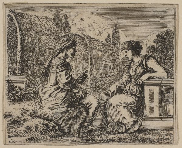 Editor: Here we have Willem de Passe's "Man en vrouw in het veld" from 1624, a print rendered in the old engraving style, fitting for the Dutch Golden Age. It depicts a man and woman sitting in a field. It has quite a lovely, serene feel to it, though I’m intrigued by what the man seems to be offering or showing the woman. What do you see in this piece, from your perspective? Curator: Indeed. Consider how dress in the 17th century reflected social standing. Their garments, particularly her lace collar and his cloak, speak to a certain affluence, positioning them within a particular stratum of society. And consider the landscape - a carefully cultivated backdrop, not the wild, untamed nature. Editor: So, the details signal more than just a casual outdoor scene? Is the offering between them a type of symbolic exchange? Curator: Precisely! It could be an offering of affection, perhaps a glove or handkerchief—laden with romantic connotations during that period. More than this, notice how the birds overhead mirror the couple below - it's a carefully constructed echo! The architecture in the distance adds another layer, possibly referencing societal stability and perhaps the permanence that marriage provides. The very placement of the figures in this meticulously crafted landscape subtly reinforces their place in the world, wouldn’t you agree? Editor: I hadn’t considered the layers of societal messaging embedded within. I was too focused on the interpersonal interaction! Thanks; I will definitely be adding all this rich imagery to my notes! Curator: Indeed! Considering these historical contexts helps reveal just how rich visual symbols are in understanding a particular moment. There's always a much larger narrative held within what at first appears to be a simple rendering.