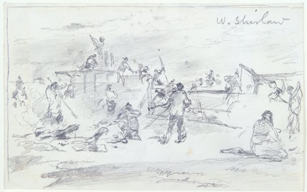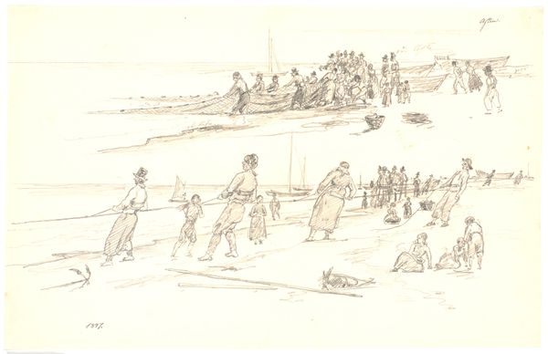 Curator: This is Martinus Rørbye's "Harvesters in the Field. In the Background, Mills and the Sea," a pen-and-ink sketch completed in 1847. Editor: It’s amazing how much atmosphere he gets with so little. The stooped figures, the endless field – it speaks of toil, of a really physical relationship with the land. Curator: Rørbye, you know, was quite a traveler, a keen observer of everyday life. This piece, even as a sketch, resonates with the burgeoning realist movement, turning its gaze toward the working class. What do you make of the aerial sketches? Editor: Well, that immediately makes me consider it as a field study. To understand his methods. There’s something incredibly grounded about this – you can almost feel the weight of the sheaves of wheat, the rough texture of their clothing. And the labor involved is palpable. These weren't leisurely field trips; there’s toil and production captured here. Curator: Exactly. This wasn't simply aesthetic observation. The social history of 19th-century Denmark is etched in these lines. We must consider that even images of common laborers have an implied political stance. Editor: I am interested by how his rapid strokes really convey a sense of labor; and you wonder about the social cost implied and consumed within it – for all of us that are living 150 years into the future from this labor! I am stuck between an interest in technique versus social impact. Curator: Both absolutely relevant avenues for observation here. What also strikes me is the inherent value in simply capturing the essence of the moment and reflecting a growing sense of self awareness about who does work in Denmark. The common folk in Denmark is finally represented and rendered faithfully! Editor: I leave here now feeling newly appreciative of Rørbye's draftsmanship but also conscious of all who have labored over what we all consume. I suppose one would walk away feeling this picture means much. Curator: I agree and believe that it makes the invisible visible in terms of Danish agrarian society, both socially and physically. Hopefully, this inspires thought and social consciousness, making this a meaningful experience to carry forward in our world.