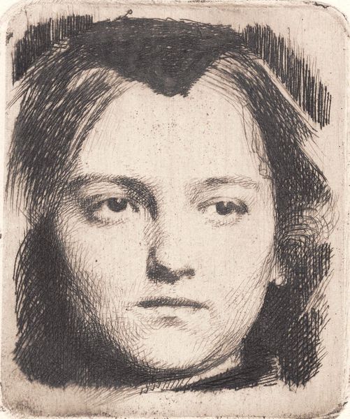Curator: This etching, entitled "Ungt kvindehoved, en face, med snip. Prøveplade", or "Young Woman's Head, Full Face, with Snipe. Test Plate", was created around 1900 by Frans Schwartz. It’s held here at the SMK, the Statens Museum for Kunst. Editor: There’s a haunting quality to it. The lines are so delicate, yet the subject's gaze is intense. It reminds me a little of early photography, like a fading daguerreotype, somehow frozen in time. Curator: You know, it’s fascinating to consider that this was indeed a “test plate,” probably intended to refine the artist’s etching technique. At the turn of the century, printmaking offered artists more accessible routes to disseminating their work, which influenced art viewership and promoted the creation of more public artworks and art communities. Editor: I am drawn to the contrast between the finely etched facial features and the more loosely rendered hair. Notice the direction of the strokes and the hatching to create a feeling of depth. Curator: Schwartz was likely experimenting with the tonality, trying to get the shadows and highlights just right. It does give a very intimate feel; in a way, this "test plate" provides an unfiltered, unvarnished study of this young woman. Were women offered the same access and opportunities within the professional art world? I wonder about the sitter herself—was she an artist, a student, or a model? Editor: It’s intriguing that a “practice piece” can carry such emotional weight. You find beauty even in the technical imperfections of such artworks. Curator: Absolutely. The imperfections, in fact, illuminate the artist's process, don't they? This piece really reflects broader movements within Danish art, namely its negotiation between impressionism and Symbolist undertones in this period. Editor: Thinking about its construction and historical period really brings depth to my viewing experience. Thank you! Curator: A closer look reveals how artistic ambition plays out through social, cultural, and individual narratives. It gives you food for thought, I would say.