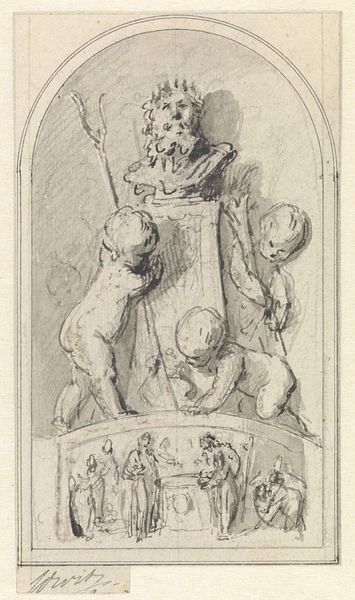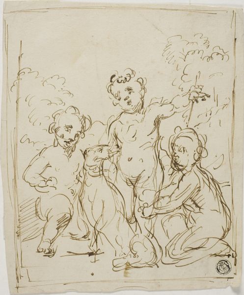 Curator: This lovely pen and ink drawing is attributed to Bernhard Schreuder, dating from around 1767 to 1780. Titled "Vijf putti bij een vaas met druivenrank," it depicts five cherubic figures clustered around a vase overflowing with grapevines. Editor: It strikes me as so playful, almost chaotic. The sketch-like quality amplifies the sense of youthful energy bursting from the composition. Curator: The putti are indeed brimming with vivacity, characteristic of the Rococo style. It is a fascinating drawing, rendered in confident lines, depicting children often found in the period, linked to ideas about love and playful innocence. Editor: Absolutely. Putti often played this allegorical role during the Rococo, often symbolizing innocence and love. The grapevines, however, can be linked to more pagan ideas linked to the god Bacchus or Dionysus that speaks about a sense of earthly abundance, too. Curator: It's also interesting to note that while putti were associated with Christianity and images of Heaven, as a theme it echoes much further back into Greek and Roman myths of nymphs and nature spirits. And of course in decorative schemes such as these, it lent itself to a very lighthearted treatment! Editor: Speaking of decorative schemes, can we look at the implications for the artwork’s public role? Rococo pieces such as this, originally designed for consumption of the upper-class public, might offer clues of how cultural power structures in Dutch society legitimized itself through leisure or through a carefree image. The absence of lower classes adds, of course, an element of classism within the scheme. Curator: You are right, but also bear in mind that its very presence here in the Rijksmuseum serves a new democratic function: It is recontextualised from purely elite viewing to something that should ideally become accessible to all! Editor: Point well taken! Overall, it gives such insights of Rococo sensibility during this period. Curator: I agree. We can really sense the playful charm that has lingered for centuries in the visual culture of Dutch imagination!
