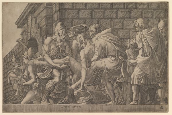 This print, titled "The Calumny of Apelles," presents a dense narrative scene filled with symbolic figures. On the left, we see Ignorance and Suspicion, whispering into the ear of King Midas, who sits in judgment. Calumny, or slander, drags a young man by the hair towards the king, accompanied by Deceit and Fraud. Behind them follows Repentance, looking back at Truth who is approaching. This story echoes through time. The motif of unjust accusation and the struggle for truth appears in numerous guises across cultures, from ancient Greek tragedies to Renaissance allegories. Consider the figure of Calumny herself – her frenzied energy and destructive force resemble the Furies of classical mythology, embodiments of vengeance and psychological torment. The emotional intensity conveyed through such figures reflects a deep-seated human fear of injustice and the chaotic power of rumor, engaging viewers on a subconscious level. This allegory of Apelles, passed down through history, reminds us of the cyclical nature of human experience, where timeless themes resurface, evolve, and find new expression across generations.