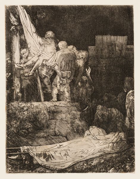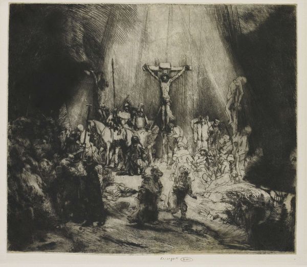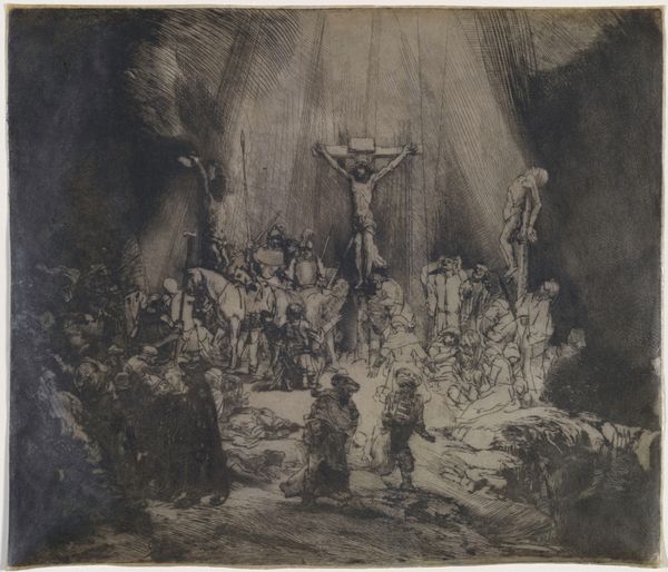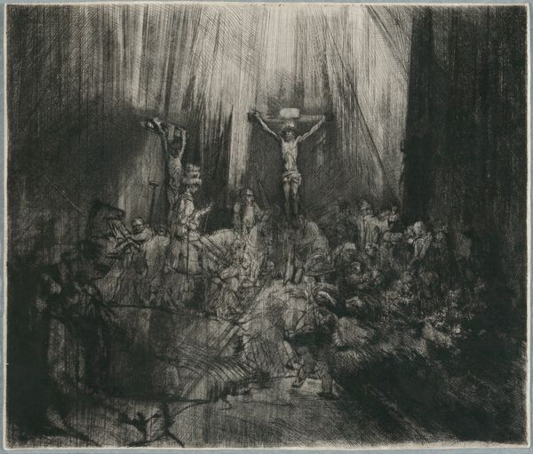 Curator: Welcome. We’re standing before Rembrandt van Rijn’s dramatic etching, “Christ Crucified Between the Two Thieves,” also known as “The Three Crosses,” created in 1653. It’s a piece brimming with complex layers. Editor: Layers is right. My initial feeling? Overwhelmed, but in a good way. Like a storm cloud gathering—you sense the immense weight and impending…something. What strikes me most is the raw emotional intensity. Curator: Rembrandt's unique rendering of this iconic biblical scene diverges quite a bit from its contemporaries, yes. In it, you can feel the socio-political unrest of the Dutch Golden Age filtering through a deeply personal lens, a society grappling with wealth, religion, and the ever-present spectre of mortality. Editor: I can feel that weight. And look at his use of light and shadow. It is masterful. See how light focuses on Christ while everyone else sort of recedes into this dark, ambiguous mass of humanity. Is it deliberate or an attempt to find his inner world as an older man? Curator: Absolutely. It emphasizes Christ's isolation, while also subtly commenting on the ambiguity of moral authority. Look at the riders, who are cloaked in darkness. Note also the printmaking technique he utilizes that suggests that. Etching, with its capacity for intricate lines, allowed Rembrandt to build layer upon layer of emotional meaning. Editor: It feels more like an expressionistic outburst than a calculated exercise. The scratching marks—raw nerve endings made visible. It looks like the feeling and emotion in the etching had to fight to get out of the copper! Curator: Some have even called his mark making, and how that lends itself to capturing a specific spiritual experience within a historical context revolutionary in his own time and something many great etchers who came after have drawn from. Editor: That raw energy still pulsates even now. When you approach art from an historical perspective as you do, it is something many art-lovers can forget. A person feeling that energy centuries after the image was wrought in that copper! Curator: And that is where a modern understanding is essential to how art should be viewed in the public square. How does the past inform the present, even here in our shared viewing experience? Editor: Something that has not changed, which you need an etching to remind you of—a work that almost seems like the art's inner emotional state. You stand here to experience and to then know it again in your own soul. I'd say that has worked on me.