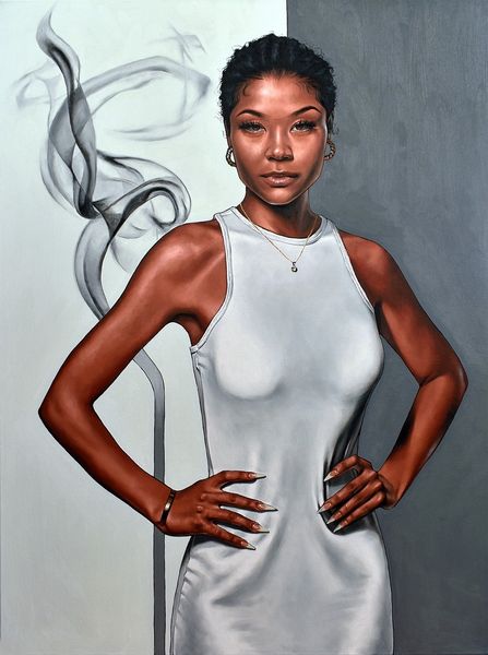 Sarah Joncas’s ‘Adrift’ presents us with a portrait rich in subtle, dreamlike symbolism. The woman's gaze holds a certain melancholic depth, drawing us into her internal world. But it is the earrings that truly capture our attention. In the form of a pyramid, this shape has appeared throughout history in myriad contexts and cultures, as a symbol of power, ambition, and ascension, from ancient Egyptian monuments to corporate logos. These earrings, however, are delicate and feminine, a subversion of the pyramid's traditional associations. They speak to a powerful, yet subtle, transformation. Like a palimpsest, images are continually layered, revised, and recontextualized; this painting invites us to consider the symbols that permeate our collective unconscious.