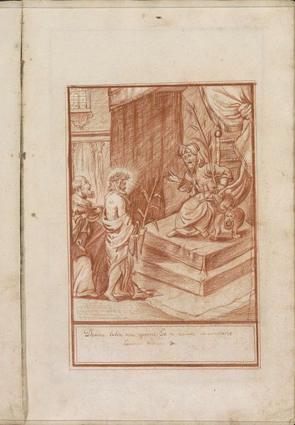 Curator: Here we have Jacob Toorenvliet's drawing, "Man with a Glass in an Interior," created around 1701 using pen and ink on paper. What are your initial thoughts? Editor: It feels like a scene plucked from a dream—or maybe a slightly tipsy daydream. The limited palette gives it this faded, almost ghostly quality. There's something vulnerable in the way the figures are rendered, even the one holding the glass. Curator: That vulnerability is intriguing, considering the context. Genre paintings during that period often served as moralizing narratives, commenting on social behavior and human folly. The glass, naturally, is a symbol. Editor: Right, the perpetual "what's he drinking and why?" I can't help but think about those Dutch Golden Age paintings laden with symbolism – like a hidden message in a bottle, perhaps? Is it supposed to be some vice, or are we simply looking at friends having a moment? Curator: It’s a delicate balancing act, I think, between revelry and responsibility. Notice the figure on the right – there is some emotional disturbance suggested here, a feeling she is conflicted and perhaps ill-at-ease. That melancholic atmosphere, paired with the slightly askew perspective, it contributes to a reading less as celebration and more contemplation. Editor: Interesting. So maybe the glass isn't the focus; perhaps the emotional temperature of the scene itself is more important than what the man is holding? I was busy assuming someone was about to regret their life choices, but it appears it's more nuanced. Curator: Indeed. The image resonates not as a straightforward story but rather as a study of fleeting emotion, hinting at inner states of unease through gesture and the very specific application of line and shade, reflecting deeper societal tensions through carefully arranged visual cues. Editor: So it's not just documenting; it is dissecting! It reminds me that art isn’t always about answering questions, but sometimes, art prompts us to ponder things that often lurk beneath the surface. Curator: Exactly. Art provides glimpses into our own interior lives. This work, through its sensitive lines and suggestion of narrative, opens just such a portal, an evocative glimpse across centuries into shared humanity. Editor: Absolutely. Cheers to that… metaphorically speaking, of course!