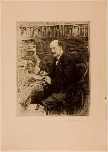 Editor: This is Sidney L. Smith's etching of George E. Littlefield. The subject appears to be working at his desk, which gives me a sense of the daily grind. What's your take on this piece? Curator: Look at the sheer volume of paper depicted. Smith highlights the means of intellectual production. The etching technique itself, labor-intensive and reproducible, mirrors the subject's work. The materials suggest a deliberate connection between the creation of art and the labor of scholarship. Editor: So, you're saying the medium is intrinsically linked to the message about work? Curator: Precisely! Smith transforms a portrait into a commentary on materiality and production. Consider, too, the historical context – how did printmaking democratize knowledge and shape access to information? Editor: That's a very interesting perspective. I never considered how the process itself reflects the subject's own work. Curator: It's about more than just the image; it's about the labor and context embedded within the art itself.