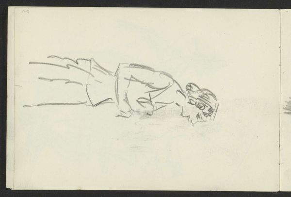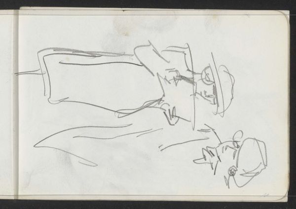 Curator: This is "Standing Man and Woman," a pencil drawing on paper by Isaac Israels, likely created sometime between 1875 and 1934, and now residing here at the Rijksmuseum. Editor: My first thought is that it's incredibly immediate. The lines are so fleeting; you can almost see the artist's hand moving across the page trying to capture a gesture. It feels unfinished, like a glimpse of something rather than a complete thought. Curator: And I think that speaks to a larger truth in art history – these intimate sketches, often from artists’ sketchbooks, can be more revealing than their polished works. We glimpse not only the artist's process, but potentially also the social dynamics at play. Who were these people? Why did Israels choose to sketch them? Was this about class? A power dynamic? What did they think of him capturing them in that moment? Editor: I am curious about the hats. What do they signify, what statements were they making, and what statements were being made about them? They offer an elegance and formality, yet the lines describing the figures suggest something casual. The combination sparks narrative possibilities, as if we are witnessing figures within a larger social narrative. The female figure also seems somewhat larger, her dress flowing, hand on her hip— a gesture communicating a power dynamic? Curator: Potentially. The gaze, as well, becomes interesting in light of feminist theory; where do you feel their eyes are pointing, how are their bodies oriented and what would that mean? If you note the orientation of their faces, you will also perceive that the light above the female figure could indicate she has light features, against the shadows over the male figure; race could very well come into play here too. The meaning here is not definite. What we are observing here is a glimpse and our reflections within that, just as much. Editor: Agreed, glimpses and traces… I see this artwork functioning almost as a kind of cultural memory preserved in lines. The fashions, the postures… They echo archetypes we've seen in art and life repeatedly. It makes you wonder how our contemporary symbols and gestures will be interpreted in the future. What weight they'll carry. Curator: I find that incredibly compelling – the cyclical nature of symbols and how we continuously renegotiate their meaning across time and culture. These ephemeral lines capturing a fleeting moment offer such rich interpretive ground when considered alongside history, sociology, philosophy and our present understandings. It reveals how art is inextricably linked to both past and present. Editor: Indeed, and these kinds of works can be portals for delving into those connections; they present visual echoes, sparking reflection and drawing us deeper into cultural consciousness.