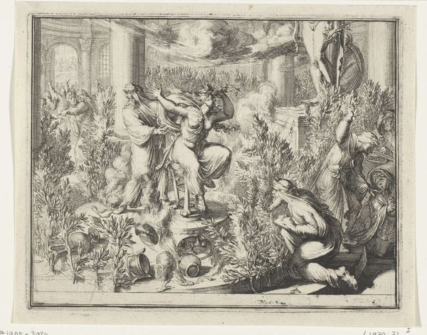 Editor: So, here we have Giovanni Andrea Podestà's "Bacchanaal met altaar, faun en Silenus," an engraving from 1640. It feels chaotic, almost a bit overwhelming with all the figures. What do you see in this piece? Curator: Indeed, chaotic is a great way to describe it! Looking at this through a contemporary lens, I'm struck by how it encapsulates the Baroque fascination with excess, and challenges to traditional morality. Think about the context: The Catholic Church was attempting to reassert control amidst the Reformation. How might the blatant celebration of Dionysian revelry, of the unrestrained body, have been perceived? Editor: So, it's almost subversive? A visual pushback? Curator: Precisely! The Bacchanaal were rituals dedicated to Dionysus (Bacchus) marked by ecstatic dance, intoxication, and sexual freedom—transgressions of societal norms. And it's not just about religious power structures; who do you think was excluded from, or perhaps even punished, by the types of excess pictured in the artwork? Editor: I guess women? Or people outside of that wealthy social class? Curator: Yes, and the visual language of classical mythology can obfuscate the structures of race, wealth and class inherent in seventeenth-century European life. This piece performs both an apparent homage to antiquity, and also a reflection of the power structures inherent in artistic patronage at this time. Editor: Wow, I hadn’t thought about it that way. It seems more complex when viewed from that perspective. Curator: It urges us to interrogate not just what's depicted, but who is being empowered, and who is potentially erased or further marginalized by the artistic choices being made. We have to ask these hard questions and place these works in a social and cultural context to have a useful discourse about them today. Editor: I’ve definitely got a lot to think about! Thanks! Curator: It has been my pleasure. Let’s continue to investigate these conversations to create more informed perspectives of these works and to deepen our discussions.