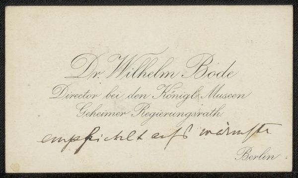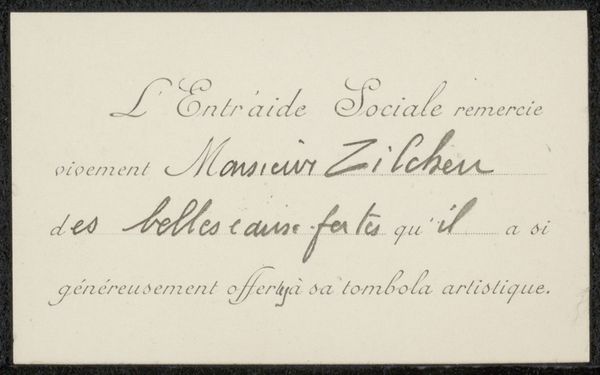 Editor: Here we have "Visitekaartje uit archief Philip Zilcken," or "Visiting card from the archive of Philip Zilcken," dating from around 1867 to 1930. It's a drawing and a piece of graphic art currently held in the Rijksmuseum. It strikes me as very formal and refined, especially with that script typography. What do you see in this piece from a historical perspective? Curator: It's fascinating how something as simple as a visiting card can tell us so much. The formality you noticed speaks volumes about social etiquette of the late 19th and early 20th centuries. Think about it: the card isn't just a name; it's a carefully constructed statement of status and affiliation. Zilcken clearly wants to showcase not only his name but also his Chevalier titles. Editor: So, it's less about simply identifying someone and more about projecting an image? Curator: Precisely. The script, the French language, and the explicit listing of honours—"Chevalier des Ordres"—all signal membership in elite circles. We need to ask: what institutions and power structures are being invoked here? Consider the social function of art – who does this card aim to impress, and what values are being communicated about artmaking in Dutch society during the time of growing art markets? Editor: I never considered the power dynamics embedded in something so small! It’s like a tiny, carefully crafted performance. Curator: Exactly. And the fact that this card ended up in an archive is telling, too. It transforms from a piece of social currency into a historical artifact, inviting us to analyze the politics of imagery and the public role of art. We move from intimate exchange to institutional collection and public presentation. Editor: Wow, that's quite a journey for a little card. I see how museums shape the way we understand even the smallest artworks now. Curator: Indeed. By understanding the social and institutional context, we gain a much deeper appreciation. I’ve really enjoyed sharing these ideas!