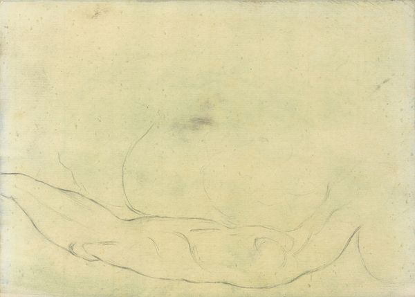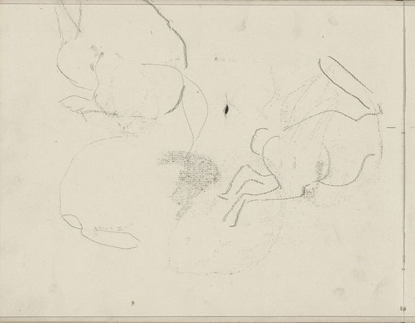 Editor: Here we have "Studie en een abklatsch van een krijttekening," which roughly translates to "Study and a Counterproof of a Chalk Drawing," created between 1875 and 1934 by Isaac Israels. It’s a pencil and graphite drawing housed in the Rijksmuseum. The thing that immediately strikes me is its incredibly sparse nature; it feels almost ghostly. What do you see in this piece? Curator: Precisely. Notice the artist's use of line. How does the composition, the arrangement of these lines, dictate our perception? We see fleeting impressions, yes? Barely-there strokes of graphite creating the *idea* of form, rather than concrete shapes. The use of negative space is just as crucial. Editor: Absolutely, the emptiness around the lines really amplifies the tentative feel of the sketch. It's interesting how little is there, but how suggestive it is. Is Israels intentionally leaving so much open to interpretation? Curator: Consider how the *quality* of line—its weight, its direction, its hesitancy—creates a dialogue with the concept of "study" itself. What is the nature of inquiry if not an exploration through suggestion and revision? Look at the variation of mark-making: Smudged areas exist adjacent to sharp contour lines, an opposition of distinct characters which guides our observation and engages active contemplation. Editor: So, it's almost about the process of seeing, rather than presenting a complete image? The marks themselves become the subject. Curator: In effect, yes. The inherent flatness of the paper becomes activated. There's no pretense here of depth or imitation of reality in a mimetic sense. Rather, the artist confronts the raw materials – graphite, paper, line – and presents the genesis of form itself. Editor: It makes me rethink the definition of "finished" in art. The incomplete nature here is so compelling. Curator: Indeed. A vital lesson of formal analysis is realizing the inherent beauty found within the structure and process, beyond subject matter. It encourages contemplation and fosters intellectual curiosity. Editor: Thanks, I can appreciate now how this emphasis on the structural and material can radically alter your interpretation of the artwork.