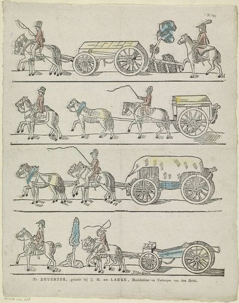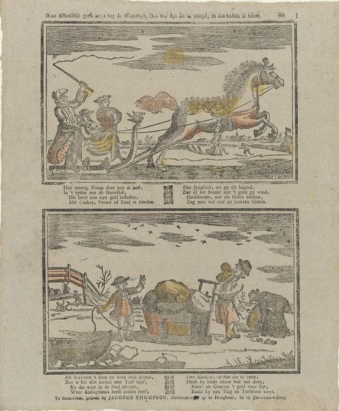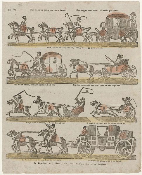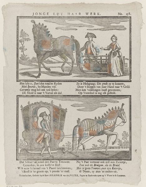 Editor: Here we have a print titled "Zie Neêrlands, koning met zijn dierb're gemalin, / En kroonprins, Neêrlands hoop en Ruslands groot-vorstin," by Jan (Sr.) Oortman, dating from sometime between 1831 and 1854. It appears to be an engraving. I am struck by the symmetry of the composition, two carriages presented one above the other, almost like reflections. What stands out to you? Curator: The diptych structure certainly creates an immediate visual relationship ripe for comparison. Note the parallelism in form—the near-identical framing, the mirroring of the horse-drawn carriages—which points towards a structural dichotomy the artist is eager for us to decode. Editor: A dichotomy? In what way? Curator: Consider the application of color. The upper carriage exhibits a lightness, an almost pastel quality, absent in the somber hues below. Is this a symbolic play with contrasting aesthetics? Is the upper carriage more ornamented? Or perhaps each choice accentuates their divergence and offers insight into its intended meaning. What do the stylistic choices tell you? Editor: Well, the lines of the lower carriage appear much bolder, giving it a weightier presence, and perhaps symbolizing the hardships or burden that carriage carries compared to the lightness and elegance of the carriage above? The symmetry contrasts through its subtle lack of symmetry... Curator: Precisely. Notice too, how Oortman guides our eye, the horses and carriages mirroring each other. The organization creates a formal unity on the surface but a deeper chasm beneath, ripe for interpretative work. It certainly allows one to explore varying formalist avenues for interpretation. Editor: I see it now! The composition itself sets up a narrative without explicitly telling a story, just through visual cues and contrasts. I will consider that as I examine this print going forward!