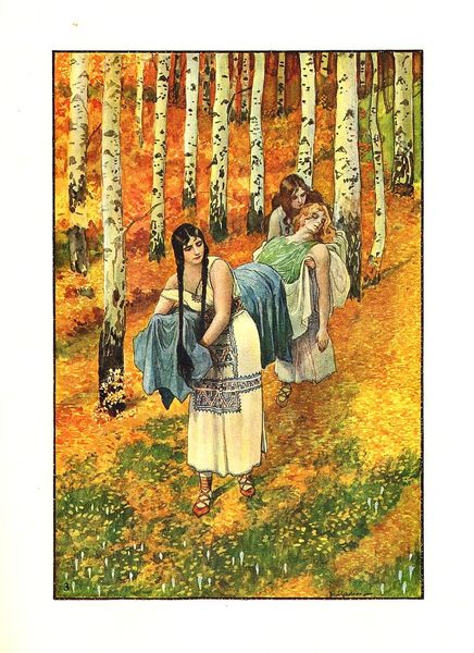 Editor: Here we have Vyacheslav Nazaruk’s Illustration for *The Ural Tales.* It evokes a melancholic, almost ethereal mood. What is your interpretation of the work? Curator: What I find particularly compelling about this piece is the intersection of folklore and national identity, deeply rooted in the sociopolitical context of Soviet-era illustration. Do you notice the way the figures are positioned within the landscape, almost dwarfed by the forest? This could be read as a commentary on the individual's relationship to the vastness of Russia, but also the all-encompassing influence of the state. Editor: Yes, that makes sense. And the folkloric clothing certainly points to an idealised Russian identity... What about the woman in the background, though? She looks almost hidden. Curator: Precisely. Her veiled presence could represent the hidden voices and suppressed narratives within these "tales," perhaps even a subtle critique of gender roles within a patriarchal society. Consider how socialist realism often portrayed idealized, productive members of society, yet this illustration hints at something more complex. Are we looking at a romanticized, but also critical, depiction of rural life? Editor: It is quite interesting how much context changes the way we interpret art, and how what seems like a simple scene can actually have many layers of meaning. Curator: Absolutely. Art doesn't exist in a vacuum. This illustration encapsulates cultural memory, gender dynamics, and potential veiled dissent, prompting us to critically examine the power structures at play in its creation and reception. Editor: I’ll definitely keep that in mind as I look at more pieces like this in the future. Thanks for your insight!
