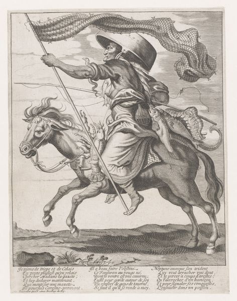 Curator: Here we have Plate 8, an engraving by Matthäus Merian the Elder, circa 1610 to 1650, titled “Emperor Otho on Horseback, from 'The First Twelve Roman Caesars', after Tempesta." Editor: My goodness, Otho really knew how to accessorize, didn't he? All that detail! It's as if he's daring the viewer to look away. Curator: This baroque print demonstrates a fascination with historical and allegorical symbols, depicting power through the image of the emperor mounted on a rearing horse, a symbol itself of Roman authority. Notice the eagle on his helmet, a common symbol of Roman imperial power, evoking strength, courage, and dominance. Editor: The horse looks almost…manicured? The way the mane curls is wonderfully absurd. But seriously, this image definitely conveys dominance. Even the tiny building in the background looks insignificant. Do you think it's meant to symbolize something? Curator: It probably situates the image in the geographical world known to its first audience, and grounds Otho's rule in something tangible and familiar. The engraving emphasizes a kind of visual continuity. What's intriguing to me is how Otho’s actual reign was quite short and turbulent; he’s not exactly known for long-lasting accomplishments. Editor: So, this grand image functions less as historical truth and more as pure... branding? Like an ancient propaganda poster? Makes you think about image-crafting, about how symbols and power intertwine, even across millennia. It seems power is about performance. Otho seems almost playful in his presentation of authority. Curator: Precisely. And the engraving, using techniques and symbolic languages already developed and known at the time, aims for the persuasive continuity of Roman authority, presenting a vision, more than just portraying a figure. Editor: Thinking about that now, I actually read that exaggerated power stance less like pure dominance, and more like performative anxiety. Maybe that’s just my projection, but it almost has an echo of desperation. Curator: A perceptive observation, one I'll ponder now whenever I look at it again. Thanks. Editor: Glad to lend a more anxiety-riddled perspective!