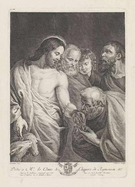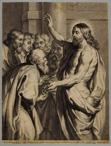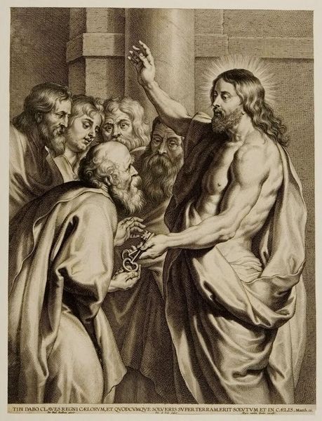 Pieter de Jode the First's engraving captures a pivotal moment: Christ bestowing the keys to Saint Peter. These keys, symbols of authority, are not merely objects; they represent the power to bind and loose, both on Earth and in Heaven. This motif of bestowing keys echoes through time. Consider the ancient depictions of Janus, the Roman god of doorways and beginnings, often shown with keys, signifying his control over transitions and passages. Here, in de Jode’s rendition, the keys take on a spiritual weight, transferring divine authority. The gesture of giving, too, is laden with meaning. Christ's outstretched hand, reminiscent of classical depictions of emperors granting power, underscores the solemnity of this transfer, a visual testament to the enduring human quest for leadership. The psychological impact is profound: a single image encapsulating themes of power, faith, and the cyclical nature of authority.