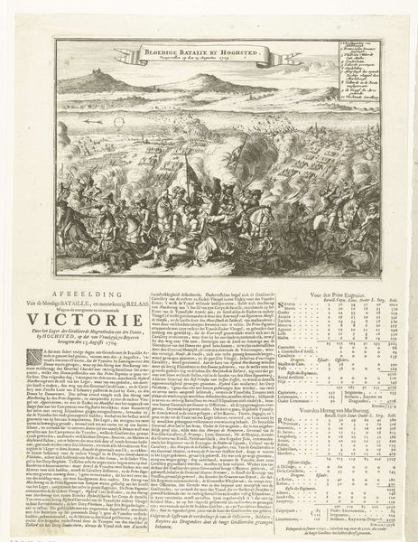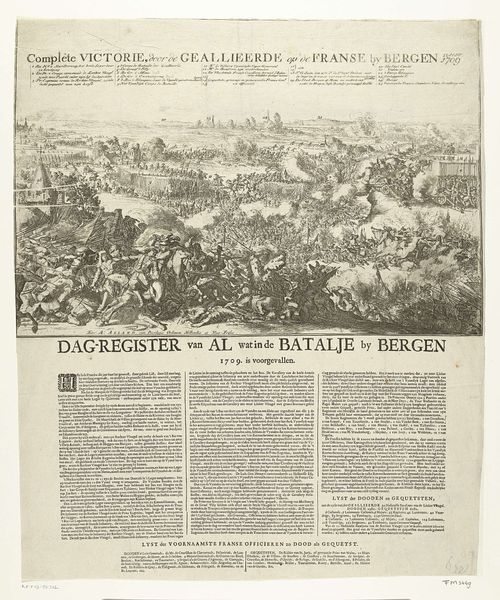 Curator: The eye is immediately drawn to the chaos and dense composition. This work seems to capture a tumultuous scene, full of action and almost dizzying in its detail. It feels...overwhelming. Editor: Indeed. What you are sensing is precisely what the image sets out to depict. This engraving, titled "Slag bij Seneffe, 1674," visualizes the Battle of Seneffe, a significant event of the Franco-Dutch War. This print, dating from 1674, and held at the Rijksmuseum, offers an interesting glimpse into how war was documented and disseminated at the time. Curator: Documentation... and perhaps propaganda? The composition definitely steers the viewer towards a specific reading of the event. How objective can this depiction really be, considering it comes just after the actual battle it depicts? Editor: Absolutely, that's crucial to consider. The patronage and purpose would heavily influence the narrative. The artist’s choice to compress so much activity into one scene reflects the perceived importance and spectacle of war. Remember that these kinds of prints helped shape public opinion, so reading the battle is very much connected to socio-political narratives. What details jump out for you? Curator: The sheer number of bodies, for one! It's a stark representation of violence. But I’m also thinking about the implied power dynamics at play – who is centred in the composition, and how might this amplify existing narratives surrounding power at the time? Are women represented? Where is race considered within such renderings of war? Editor: Good questions. It's vital to recognise the limitations. Battle scenes, typically focused on male heroism, frequently erase women’s roles. While less overt than later periods, racial dimensions existed in 17th-century European warfare too. The artist makes specific representational choices, and its equally crucial to assess what isn't being depicted. Curator: Thinking critically about this absence challenges us to actively reconstruct fuller historical narratives, moving beyond limited visual representations. Editor: Exactly! Examining "Slag bij Seneffe" is an engagement with history itself, revealing not only events but the societal filters through which events are documented, remembered, and understood. Thank you for sharing your impressions! Curator: Thank you. I feel as though the piece allows the start of conversation, despite the historical limitations, a crucial reflection for a more critical view.