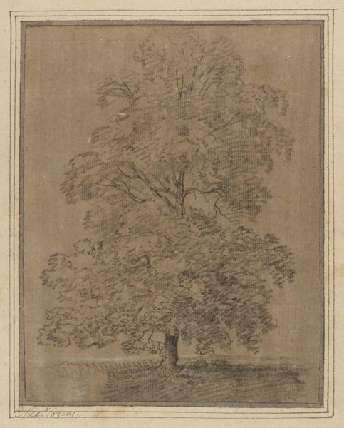 Editor: So, here we have Franz Edmund Weirotter's "Boomstudie," made sometime between 1740 and 1771. It's a pencil drawing, and there's something so delicate and ephemeral about it. What strikes you most when you look at it? Curator: I am immediately drawn to how the tree stands as a symbol of resilience and time. Notice the deliberate imperfections of the aged paper. Does this, perhaps, indicate a yearning for simpler times or lost innocence? Consider how the tree as a visual icon connects across cultures. Editor: I hadn't considered the paper itself contributing to that feeling! So, beyond just being a tree, what other symbolic weight might it carry? Curator: Think about the roots hidden beneath the surface—are they a metaphor for hidden knowledge, suppressed histories, or the unconscious mind? Note that the landscape gives shape and also confines the central figure, in this case, a single, majestic tree. Editor: That’s interesting. I was just thinking about how it’s solitary. Is that significant? Curator: Solitude can represent both isolation and strength, no? It appears the fence encloses but it is not a strong barrier: notice the delicate line-work, almost skeletal. The fence gives context but cannot constrain what it surrounds, symbolizing perhaps humanity's fraught relationship to the natural world. Does it invite introspection about how we affect the Earth? Editor: It's fascinating to think about all those layers of meaning embedded in what seems like a simple drawing. Thanks for illuminating that! Curator: It’s these quiet contemplations that can reveal the soul of the image, revealing something new about ourselves and cultural memory.