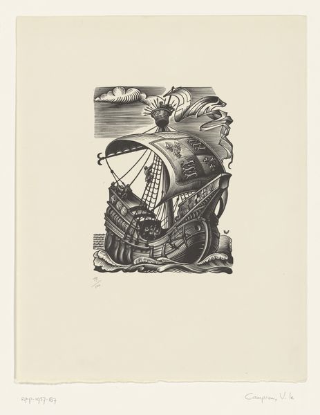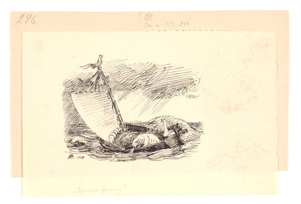 This is an undated print by an anonymous artist; a New Year's greeting card made for Gianni Mantero around 1938. The composition, reminiscent of an Expressionist woodcut, uses bold lines to depict a small ship struggling against a stormy sea. The sails are emblazoned with the name ‘Gianni Mantero’. Figures clamber on deck amidst life buoys, while a cherubic figure stands lookout on the mast. The overall effect is one of precariousness. The sepia ink lends a nostalgic quality, yet the dynamic lines and chaotic composition suggest a world in flux. The image is not merely a greeting; it is a comment on the uncertainty of the times, conveyed through its dramatic, almost frantic mark-making. The juxtaposition of the cherub and the turbulent sea encapsulates the tensions between hope and despair that were so resonant during the period. The image does not offer a simple message of cheer. It’s formal qualities underscore a more nuanced reflection on the human condition amidst historical currents, leaving us to consider the complexities of hope, and the resilience of the human spirit.