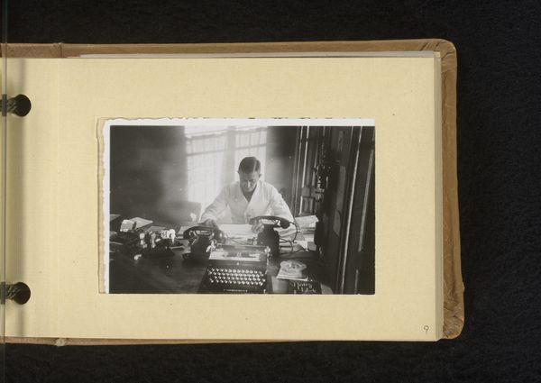 Curator: Here we have Robert Frank’s photograph, "Jack Kerouac," dating from 1959. It’s a black and white image. Editor: It strikes me as intimate. There's Kerouac, caught in a domestic interior, apparently mid-sentence. He is surrounded by plants and seems entirely absorbed. Curator: The means of production are interesting here. Look at the material contrast between Kerouac’s rough, checked shirt and the more bourgeois wallpaper that seems to partially obscure Kerouac typing at his typewriter, hinting at both the accessibility and labor of artistic creation, but its embeddedness within a consumer context. Editor: Absolutely. The plants act like symbolic curtains, framing the writer in a theatrical yet natural tableau. They also symbolize growth, inspiration perhaps? Or the organic process of creativity itself, struggling within and against a stifling context? Kerouac seems framed, in layers. It brings out both his humanity and struggle. Curator: Exactly, think of the process of creation and its connection to place, labor, and value. This wasn't a staged set. This was someone’s home, with domestic labor visible. The labor of making a home alongside the work of creating. A place in the world being built at the same time that worlds within stories are made by typing at the machine in front of him. We see, even the typewriter has materiality and speaks to what technologies of writing are capable of making. Editor: And those floral patterns behind him, and surrounding, recall earlier traditions. You know, Victorian ideals about domesticity and nature brought into the home to remind its occupants about life cycles and connections beyond the industrial and everyday, suggesting that writers must keep connected to these archetypes, to make sure their writing comes alive. Curator: It speaks to the complexities and the lived realities inherent to all art-making. Nothing springs forth fully formed without an entire architecture of material conditions and history. It feels quite raw and documentary in that regard. It gives food for thought on the daily efforts that underlie creativity and cultural movements. Editor: A lasting image, indeed. Curator: Absolutely, a fascinating nexus of culture, class, and production.
