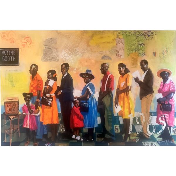 Charly Palmer’s “Big Day Dreams” is a painting in which figures are set among cotton plants, and the artist uses oil paint on canvas to explore themes relating to identity and history. Palmer’s work often reflects on the African American experience, and is rooted in personal and collective histories. Here, the figures depicted are engaged in the laborious work of harvesting cotton, a crop historically tied to slavery and racial oppression in the United States. The vibrant colors and expressive brushstrokes contrast with the harsh realities of this history, creating a dialogue between past and present. Palmer develops alternative narratives, focusing on resilience, dignity, and the enduring human spirit. The title "Big Day Dreams" suggests aspirations and hopes that persist despite difficult circumstances. This infuses the artwork with an emotional depth, inviting viewers to reflect on the complexities of memory, identity, and the ongoing struggle for equality.