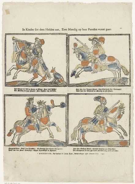 Editor: This is "Slag van Jena / Bataille de Jena" by Philippus Jacobus Brepols, dating from sometime between 1800 and 1833. It’s an engraving, and quite small actually. It’s got all these little scenes from a battle, stacked on top of each other. It’s almost cartoonish, but still…grim? What do you see in it? Curator: Immediately, I’m drawn to the way Brepols layers the imagery. It's almost like a tapestry, but instead of threads, we have moments in time woven together. What does the repetition of these figures, these same actions echoed across different tiers, evoke for you? Editor: A sense of inevitability, I think. Like the battle is playing out on repeat. Is that what you mean? Curator: Precisely. The repetitive nature mirrors the cyclical nature of conflict itself, doesn’t it? Each figure, each weapon, each horse carries the weight of past conflicts, informing and shaping the present moment within the image. Consider the flags, too. They are symbols not just of nation, but of accumulated historical grievances and aspirations, wouldn't you agree? Editor: Definitely. And seeing them rendered so…simplistically makes them even more powerful, somehow. Like archetypes of war. I’m beginning to see this as less a historical depiction, and more like… an idea about conflict. Curator: Yes! The battle of Jena becomes almost allegorical, transcending its specific historical context to represent broader themes of power, violence, and the enduring human propensity for conflict. It's like cultural memory being imprinted on the page, isn’t it? Editor: I hadn't thought about it that way. This has completely changed how I see this piece. Thanks! Curator: My pleasure. Exploring the layers of meaning in art is always a rewarding experience.