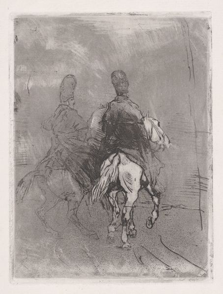 John-Lewis Brown created this print, “Hussard,” likely in France during the second half of the 19th century. It depicts a soldier on horseback, rendered in stark black and white. The figure of the Hussard, a light cavalryman, carries with it a weight of cultural baggage. They were often romanticized figures, associated with bravery, honor, and a certain swashbuckling attitude. Brown’s artistic training at the École des Beaux-Arts certainly would have exposed him to the military and equestrian imagery that glorified France’s Imperial past. This piece, however, seems to offer a more sober reflection on military life. The use of stark contrasts creates a somber tone and a sense of isolation, which suggests a less glamorous and more reflective view of the soldier’s role. To fully understand this print, one might delve into military histories, popular prints, and even fashion plates of the period, to reconstruct how the image of the Hussard functioned in the French imagination. Ultimately, the meaning of this artwork lies in its complex relationship to the society that produced it, a society still grappling with the aftershocks of revolution and empire.