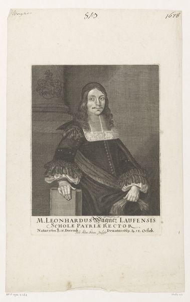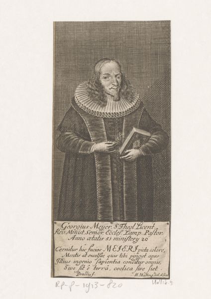 Curator: My word, he looks important! Austere, powerful... that ruff alone speaks volumes, doesn't it? Like a halo of starched linen. Editor: Indeed! This is a print, an engraving specifically, called "Portret van Sigmund Herelius," possibly created between 1618 and 1628 by Hans Troschel. Herelius was a rather prominent figure. These engravings were, of course, essential for circulating images and establishing status. Curator: Status, yes! Look at him, clutching that intricately carved goblet and those feathered plumes. Symbols, all! I wonder what they signified for Herelius himself? Is it power? Refinement? Editor: The goblet could reference communion and religious authority, and the feathers may speak to literary or intellectual pursuits, nobility even. Let’s remember these portraits served as key signifiers of rank. Curator: He seems so very still... as though time has settled heavily upon him. His face betrays weariness. The fine lines etched there mirroring, I suppose, the engraver's lines, but on flesh. I almost feel his solemnity across the centuries. Editor: The Baroque period sought to capture dramatic emotion. While he is certainly reserved, there’s a definite sense of presence, aided by the rather sharp, contrasting lines typical of engraving, setting him against a more ambiguously rendered background, pillars that seem to disappear. Curator: Yes, and his cloak appears rather theatrically draped, almost a burden he’s obligated to carry, much like I suppose nobility has its burdens? The soft and subtle rendering in it is amazing too! How an engraver could capture such drapery amazes me! It creates an effect which otherwise feels heavy on my heart, a stillness and introspection that are hauntingly familiar. Editor: I’m intrigued by the inscription at the base; these epigrams offer insights into how his contemporaries perceived his achievements, often emphasizing civic virtue or spiritual values to complement the visual representation. Curator: Yes, a rich life immortalized, flattened to the surface but voluminous in memory, no? Thanks to Herr Troschel, anyway. Editor: A carefully considered image shaping public persona – and that is now part of art history, where his story continues.