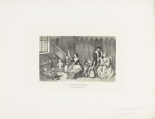 Curator: Here we see Auguste Raffet's print, "Ah! Here's Papa," a vignette offering a glimpse into 19th-century domestic life. Editor: It’s striking how Raffet uses the stark contrasts of light and shadow to draw the eye right to the center, where the drama unfolds. The woman is collapsing. Curator: Indeed. This image captures a poignant moment of homecoming, complicated by the woman's apparent distress upon her husband's return, hinting at deeper social and personal tensions. Editor: The composition's dynamism is remarkable. The lines of sight, from the children to the returning man and then to the woman on the floor, create a compelling narrative arc. Curator: Raffet masterfully depicts the complexities of familial relationships amid the backdrop of 19th-century France, inviting us to consider the roles and expectations placed upon individuals. Editor: Seeing how the arrangement of bodies creates a focal point is something that helps us understand the emotional crux of this print. It all coalesces into something very dramatic.