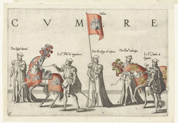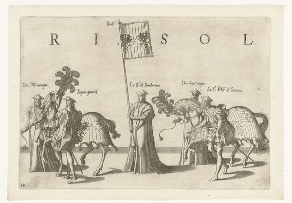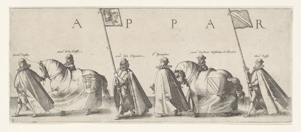 This engraving, “Deel van de optocht, nr. 9,” was created by Joannes van Doetechum around the late 16th century. Notice how the composition unfolds with a frieze-like quality, presenting figures and a horse in a procession, each meticulously detailed yet somewhat flattened against the neutral background. The artist orchestrates our gaze using line and form. Observe the verticality of the flagstaff held by one of the figures, which anchors the center of the composition. The figures are distinguished by their elaborate costumes and dignified bearing, and each element, from the folds of the drapery to the horse's decorative trappings, is rendered with careful precision. Consider how the arrangement of figures, combined with the heraldic symbols, functions as a carefully constructed visual language. Doetechum presents us not merely with a scene, but a symbolic representation of power and status. It remains an open question how we interpret the cultural codes which may have informed the work's making and reception.
