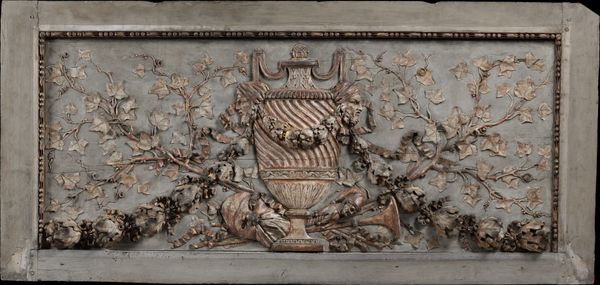 This plaster relief panel representing 'Spring' was crafted by François Joseph Belanger. The balanced composition immediately draws the eye. The symmetrical arrangement of floral motifs around a central vase evokes classical ideals of order and harmony. Look closely at the vase, its form is enhanced by the rhythmic play of light and shadow across its fluted surface. The texture of the plaster further accentuates the naturalistic rendering of flowers and foliage, giving the panel a tactile quality. The choice of plaster as a medium reflects the period's fascination with classical art and its integration into interior decoration. Consider how the muted palette contributes to the overall sense of refinement. The panel serves as a sophisticated emblem of seasonal renewal, embodying both the aesthetic and philosophical values of its time. It invites contemplation on themes of beauty, nature, and the cyclical rhythms of life.