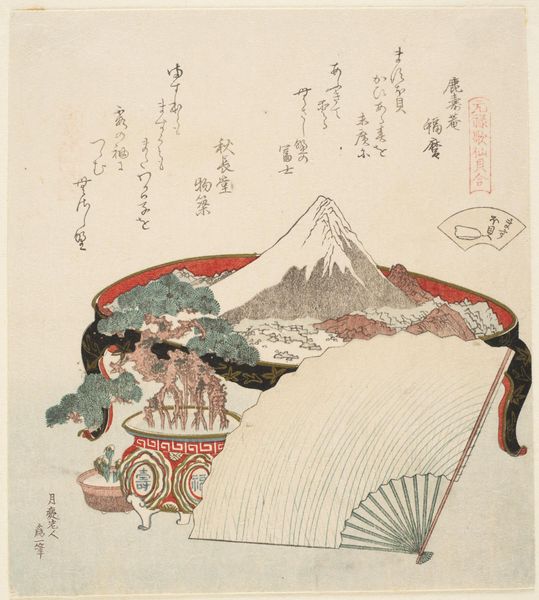 Editor: Here we have "Two Men at a Shrine," a woodblock print in ink from the early 19th century by Totoya Hokkei. I’m immediately drawn to the quiet stillness of this scene, a humble pilgrimage, maybe? The distant mountain, the figures in quiet contemplation... what strikes you about this work? Curator: Stillness is the perfect word. It whispers, doesn’t it? Hokkei captures this palpable sense of reverence. I always imagine the rustling of robes and hushed whispers of prayers in this print, as if time is taking a respectful pause. Do you notice how the strong verticals of the Torii gate almost slice the print in two, juxtaposed against the rolling landscape with that teeny tiny Mount Fuji way off in the distance? Editor: I do, yes! The Torii gate feels like a doorway between two worlds. There is text included as well. Curator: Precisely. These prints were made to be consumed fully—visually, intellectually, spiritually, even. Hokkei layers this print so thoughtfully, creating little narratives in plain sight that all ultimately lead back to the tranquility of faith. I wonder if we are those figures, just for a moment, and this image reminds us to reconnect to the beauty around us. Editor: That's beautifully put! The text and gate creating doorways really gives the feeling of a pathway. Curator: Exactly. And that little smudge in the corner! Think of how this simple form, perhaps unintentional, could shift perspective or mood if not positioned just there. Makes you think about the whole image as this delicate balance of forces, doesn't it? Editor: Absolutely. I'll definitely look closer at prints going forward, I think! Curator: Good, let them reveal their whispers and unexpected moments of grace!