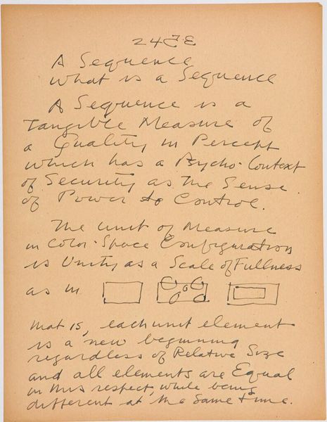 Editor: Here we have Stuart Davis' "Art Theory Text with Sequence Diagrams." It's a pretty straightforward piece of writing on paper, and it feels almost like a peek into the artist's stream of consciousness. What do you make of it? Curator: You know, it’s funny, because it almost reads like a philosophical koan. "Sequence is an object..." It's Davis wrestling with the fundamentals of abstraction, wouldn’t you say? Is he trying to nail down his artistic process or to define something fundamental? Editor: Perhaps both? I'm struck by how simple, yet dense, it is. Curator: Right! Perhaps it’s about how we perceive reality— how our mind transforms abstract sequences into something tangible, something "psychological." Editor: It definitely gives me something to think about. Curator: Me too! And that’s art doing its job, isn’t it?