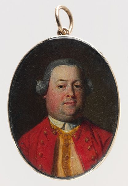 Curator: Here we have a miniature portrait of John St. Clair, rendered in oil paint. John Singleton Copley completed this piece in 1758, and it is currently held at the Metropolitan Museum of Art. Editor: It’s remarkable how this small, oval form holds such presence. The subject's rosy cheeks give a feeling of warmth, of life pushing against the dark backdrop and the stiffness suggested by his formal attire. It strikes me as both intimate and official. Curator: The crimson military coat worn by St. Clair, sharply contrasted with a darker blue, signals authority, doesn't it? Red has often been aligned with power and courage throughout history, and that association is quite clear here. He also wears a pure white stock which could symbolize innocence and purity, while its contrast with his military clothing can hint at dual loyalty, civilian or militaristic? Editor: Considering that Copley used oil paint here on such a minute scale, I am compelled to think about his working conditions. Imagine how reliant he must have been on natural light, painstakingly mixing such bright colors from raw materials in the mid-18th century, not to mention the cost of such high-quality pigments for his patron to bear. This labor-intensive aspect imbues the work with its aura. Curator: The Baroque influence is tangible, evident in the drama, intensity, and implied movement—qualities further emphasized by the symbolic weight given to colors and textures of clothing. He almost looks as if he is mid-motion, maybe about to offer some instruction. Editor: And how would it have been received? As a trinket to carry or gift perhaps, showing possession? The golden loop would have let its bearer display and showcase ownership but it is so small... What a feat it is to own even a likeness in a consumer society where production depends on specialized roles in labor to produce it and for what function and market exactly? Curator: Indeed, perhaps this miniature acted as a symbolic extension of St. Clair himself, carried to reaffirm rank and legacy, not just displaying likeness, yet it's the way in which symbols get consumed and displayed, the social function of their consumption which I see to be more fascinating here. Editor: Well, looking again, the way the oil paint has aged actually speaks to a deeper material temporality that also moves me. The objecthood of John St. Clair lives on despite its small presence through material qualities which stand the test of time!