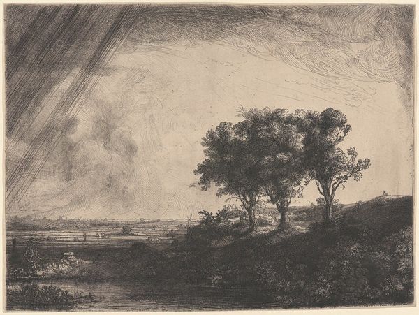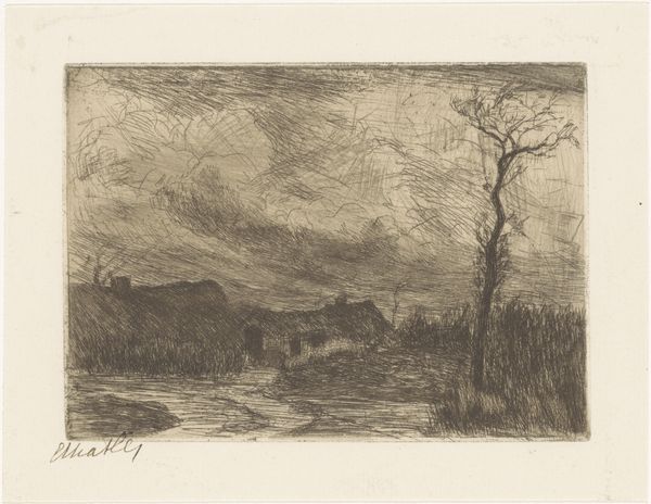 Robert Swain Gifford created this etching, Near the Coast, using a metal plate, likely copper or zinc, covered with a waxy ground. The artist would have drawn through this ground to expose the metal, which was then etched with acid. The material qualities of the plate and the acid's bite determined the depth and character of the lines. This process, known as etching, allows for fine detail and subtle tonal variations. The density of the marks creates depth and atmosphere, evoking a somber, windswept scene. This printmaking technique was part of a broader ecosystem of image production that allowed for wide distribution. It democratized art by making it more accessible beyond unique, hand-painted works. The labor involved in creating the original plate contrasts with the relative ease of producing multiple impressions. The commercialization of art through printmaking reflects the changing dynamics of artistic production and consumption in the 19th century, highlighting the intersection of art, labor, and market forces.