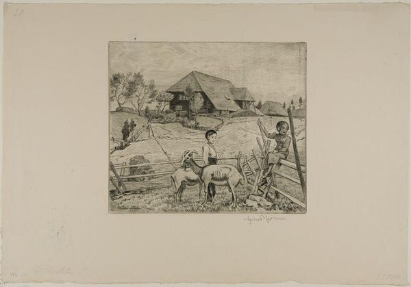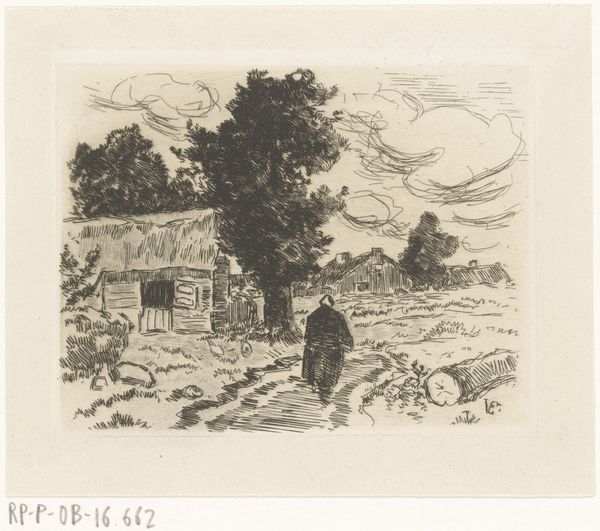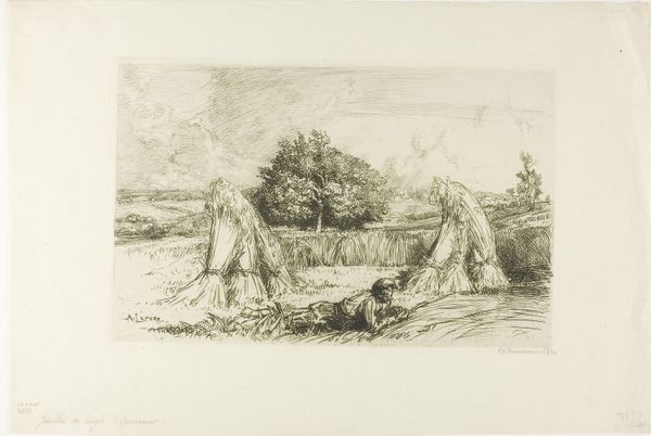Auguste-Louis Lepère made this print, The Flooded Marais: The Shepherd, probably in the late 19th or early 20th century using etching. What I notice first is the incredible detail achieved through a network of delicate lines. It gives the whole scene a kind of shimmering, atmospheric quality. The lines vary in thickness and density, creating different tones and textures. Look at how he renders the water with these horizontal strokes, suggesting its reflective surface. Then, compare that to the more chaotic lines used for the foliage and trees, which gives them a sense of volume and depth. Lepère really knew how to orchestrate marks to create a mood. The stark contrast between light and shadow is also pretty remarkable. Notice how the dark areas around the figure really makes them pop, almost like a spotlight. It reminds me a little of some of the landscape work of Camille Pissarro, who was also experimenting with printmaking around this time. It just goes to show how artists were exploring new ways of capturing the world around them. What really gets me going is that these artists were actively shaping how we perceive and experience landscape today.