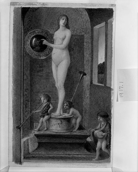 Curator: Here we have "The Suicide of Lucretia" attributed to Abraham Bloemaert, estimated to have been painted sometime between 1561 and 1611. Editor: It's immediately striking how stark this image is. The high contrast, the monochrome palette – it amplifies the drama, doesn't it? A sort of theatrical moment, frozen. Curator: Indeed. It’s a powerful rendering of Lucretia, a noblewoman whose story became a cornerstone in discussions of female virtue and Roman Republican ideals. The painting speaks volumes about the political landscape of the time, engaging with concepts of honor, power, and the repercussions of sexual assault. Editor: I see that, but also look at how the light emphasizes her form. The stark lighting defines her musculature; even in agony, there's an idealized beauty. It's almost sculptural in its treatment of form and light. Curator: Consider the historical implications. Lucretia's suicide was not just a personal tragedy; it ignited a revolution, marking the end of the Roman monarchy and the dawn of the Republic. This act, therefore, transcends the personal and becomes a potent symbol of resistance against tyranny and the reclamation of autonomy. The act itself becomes a referendum. Editor: The sword—it serves as a visual anchor, doesn't it? Leading the eye directly to the wound and her pained expression. The artist's use of foreshortening and the crisp lines create a sharp focal point. Curator: Absolutely. Furthermore, her defiance—notice the raised arm and clutched cloth—emphasizes her final act of reclaiming control over her body and her narrative, particularly relevant when we view it through a feminist lens today. Editor: Yes, seeing this work certainly goes beyond the immediate drama, it becomes an intersection of light, form and symbolic gravity. Curator: Absolutely. Considering Lucretia's act through the prism of historical trauma and female agency reshapes our comprehension. It calls for deep introspection on patriarchal structures and the enduring quest for self-determination. Editor: For me, returning to my initial perspective, the piece underscores how potent artistic choices regarding color and contrast can sculpt not just form, but also perception.