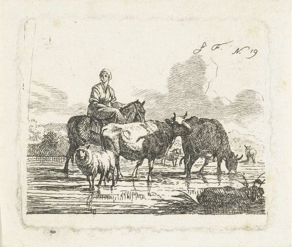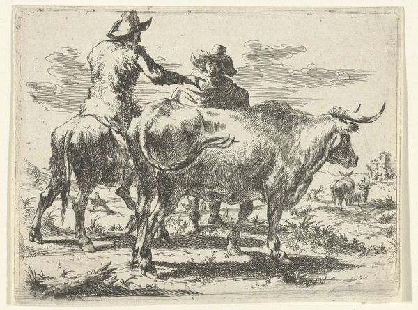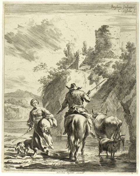 Cornelis Visscher created this print, *Shepherdess Riding on a Donkey*, as part of his *Four Landscapes* series in the mid-17th century. During this period, the Dutch Golden Age, the Netherlands saw an increase in depictions of everyday life and ordinary people. Here, we see a woman elevated on a donkey, guided by a male figure who appears to be of a lower class. This composition reflects the social hierarchies of the time, yet there is a sense of naturalism that perhaps challenges the formality of traditional portraiture. How does the shepherdess feel about her position? Is she empowered by it, or is she merely fulfilling a role dictated by societal expectations? Visscher invites us to consider the nuances of these relationships within the rural Dutch landscape. The landscape in the print is both idyllic and functional, hinting at the labor and management required to maintain such scenery. The presence of animals suggests a pastoral harmony, but also raises questions about human control over nature. What emotions does this evoke in you?