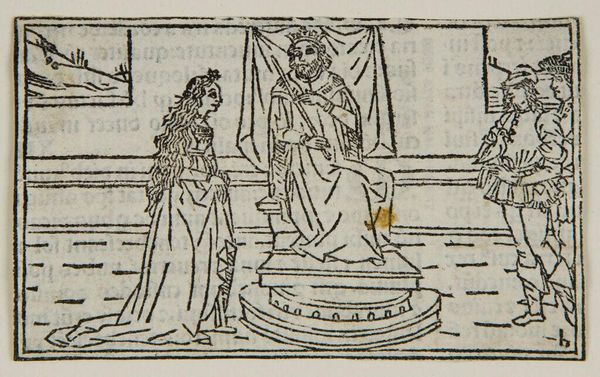 Editor: Here we have "Polia in the temple of Venus," created by an anonymous artist. This small-scale drawing feels incredibly deliberate. All the figures and decorative elements are so carefully placed. What do you make of this composition? Curator: It’s like stepping into a dream, isn’t it? This image, though simple, hints at a much larger narrative. I see a world where classical ideals mingle with... perhaps a touch of the forbidden? Look at the kneeling figure. Is it reverence or supplication? Editor: That's a great question. I was so focused on the aesthetic, I didn't consider the emotions. Curator: Art is like that, isn't it? A mirror reflecting our own curiosity and maybe even a bit of ourselves. Editor: I think I'll carry that with me. Curator: Wonderful!